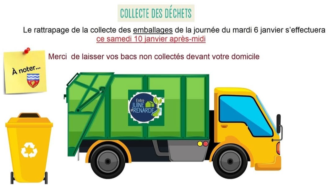 La CCEJR vous informe qu'un rattrapage du ramassage des emballages (container jaune) du mardi 6 janvier sera effectué le samedi 10 Janvier dans l'après-midi. Merci de laisser vos poubelles jaunes devant votre domicile.
